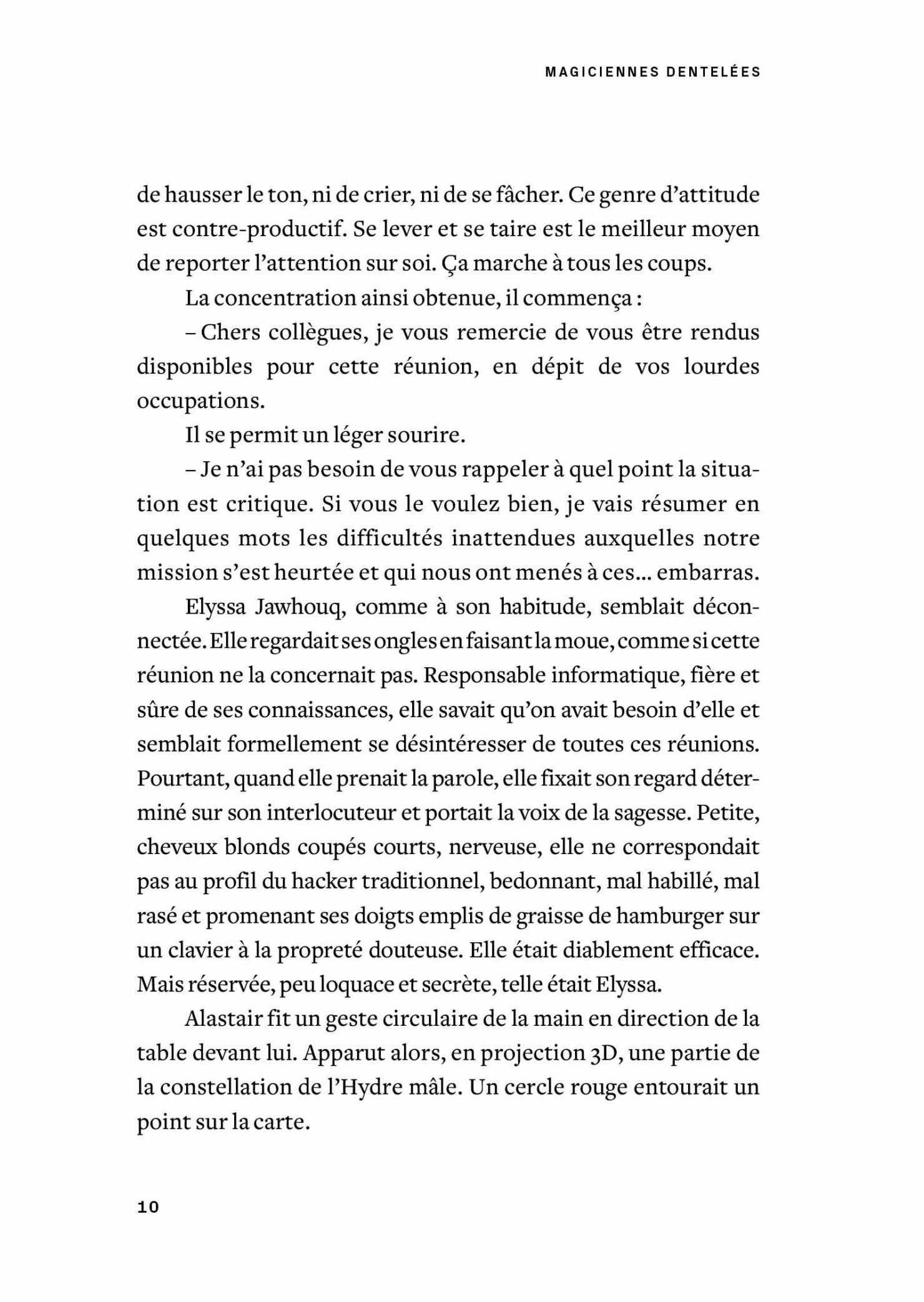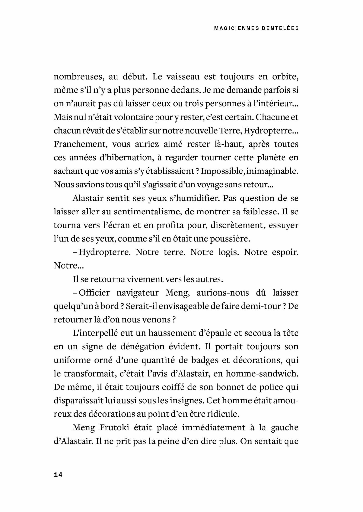 Parsemée de références au genre de la science-fiction, chaque nouvelle révèle l’absurdité de nos grandes entreprises humaines, et la facilité avec laquelle celle-ci peut être contrecarrée. Par la ruse, par le hasard, ou par un grand cœur. Entre satire à la Starship Troopers (dans sa version cinéma de Paul Verhoeven) et clins d’œil croisé à la bibliothèque de Babel de Borges et à Alien, en passant par un retour aux sources (Sir Arthur Conan Doyle), Magiciennes dentelées et autres récits se veut un hommage aux écrits de l’imaginaire et à leurs auteur·ices. Il s’agit également d’un ouvrage ouvert, accessible à ceux et à celles qui commencent leur immersion dans cette littérature si particulière, résolument anthropologique, assurément exotique.